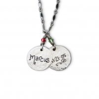 The Silver Name Necklace ~ A wonderful gift that keeps her loved ones close to her heart. This .925 Sterling Silver bar link chain features hand hammered discs, measuring 9/16 inch, with your custom inscription (name on front, birth date on back) and is topped with the corresponding birthstone crystal.