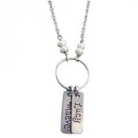 The Custom Name Tag Necklace ~ Show mom you love her with this beautiful custom piece featuring sterling silver tags, hand cut & custom inscribed, collected on a delicate sterling silver ring, attached to an 18″ chain with freshwater pearls.